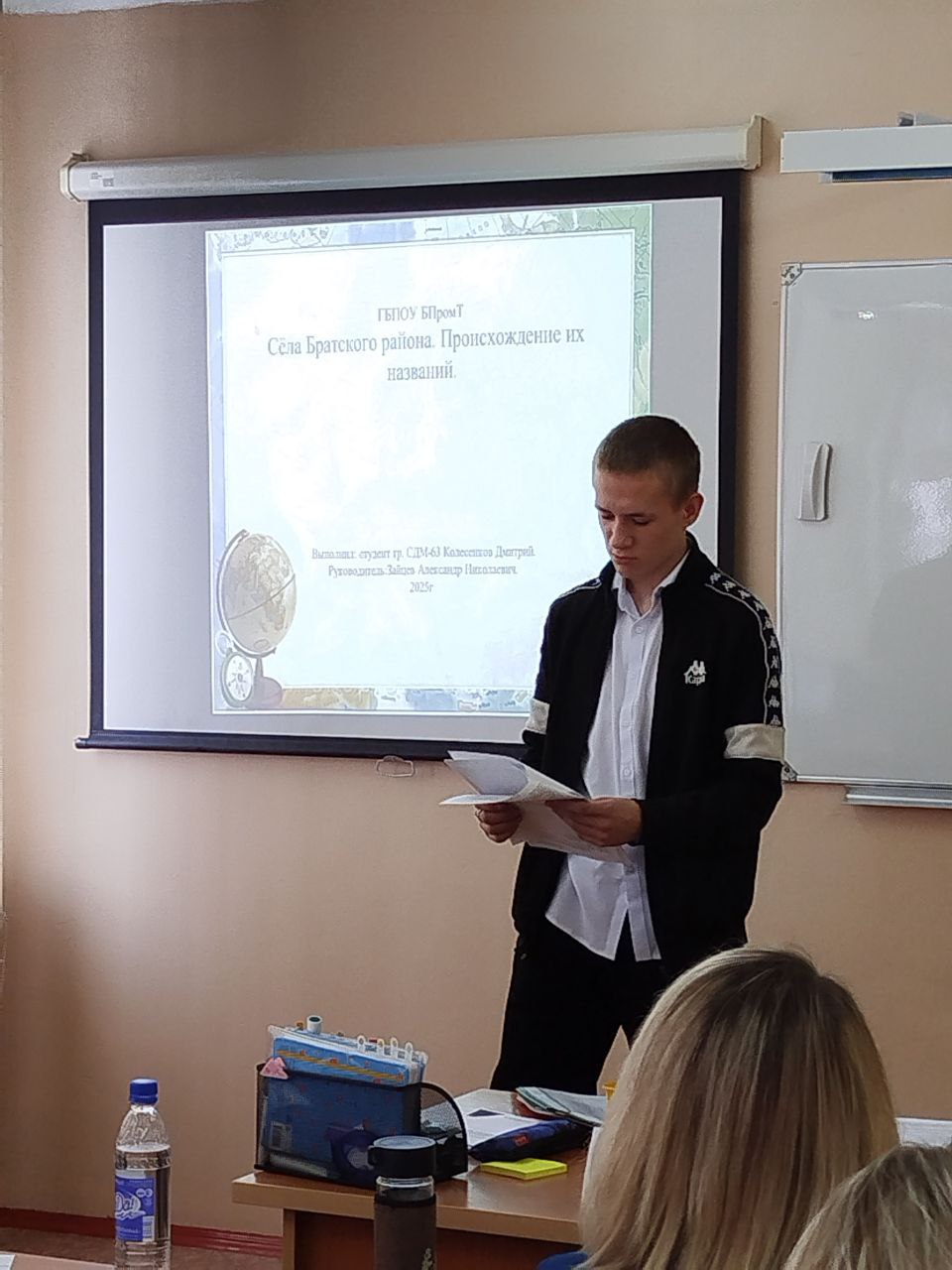 В секции «Образование через исследование» Колесенков Дмитрий, студент группы Мр-3 представил работу «Сёла Братского района. Происхождение их названий» (руководитель А.И. Зайцев) и получил заслуженное 2 место.