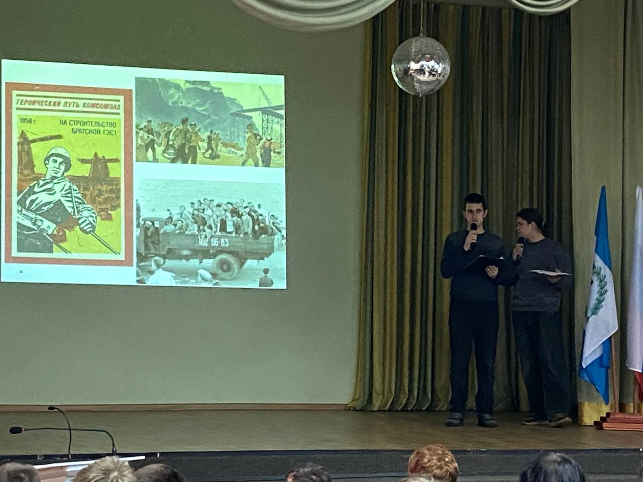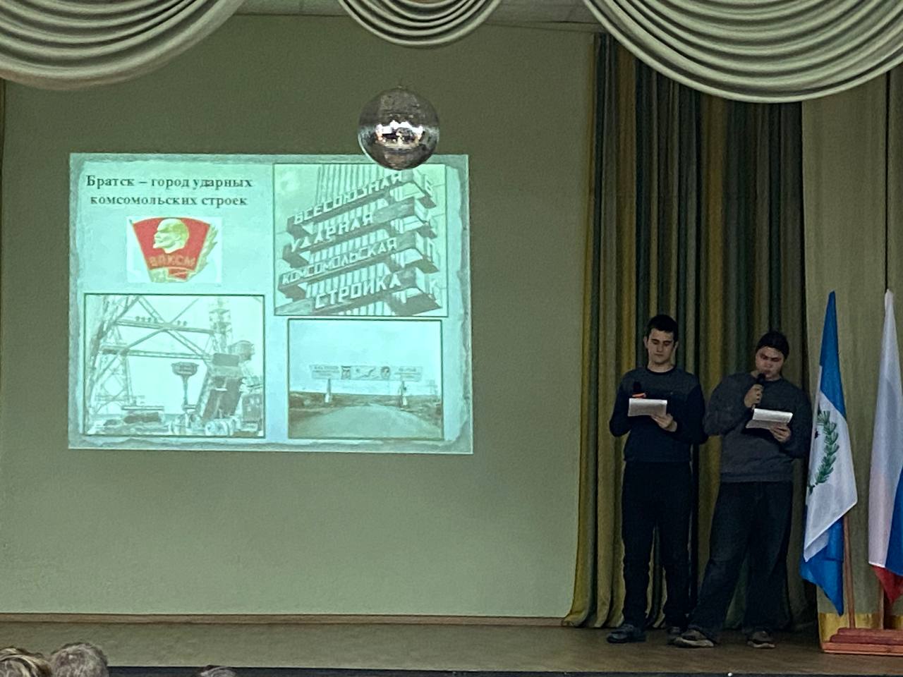 В ходе мероприятия студенты увидели видео с песнями, ставшими символами эпохи: «Прощание с Братском», «Главное, ребята, сердцем не стареть», а также клип, посвящённый ЛЭП-500 — одной из самых трудных и героических строек того времени. Зал затаил дыхание, слушая строки о том, как молодые люди со всей страны, не раздумывая, бросали родные дома и ехали строить будущее в «город-мечту».